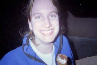 Darcy eating a chocolate ice cream cone, with a mustache!